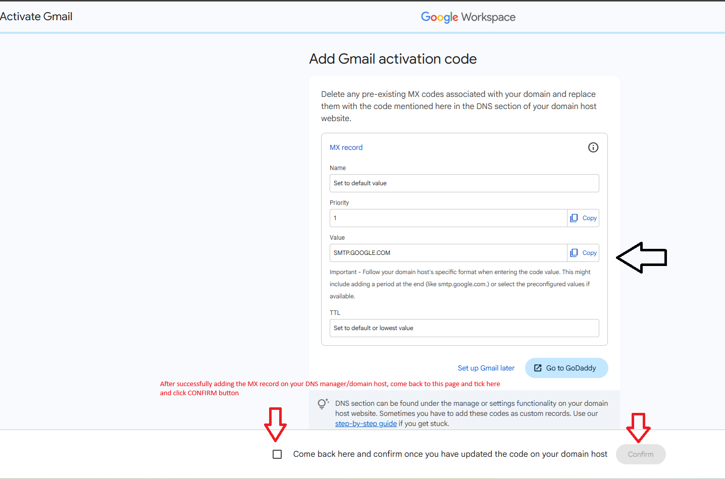 18. Under the Add Gmail Activation Code page, copy the value (usually is SMTP.GOOGLE.COM or ASP1GOOGLE.COM)